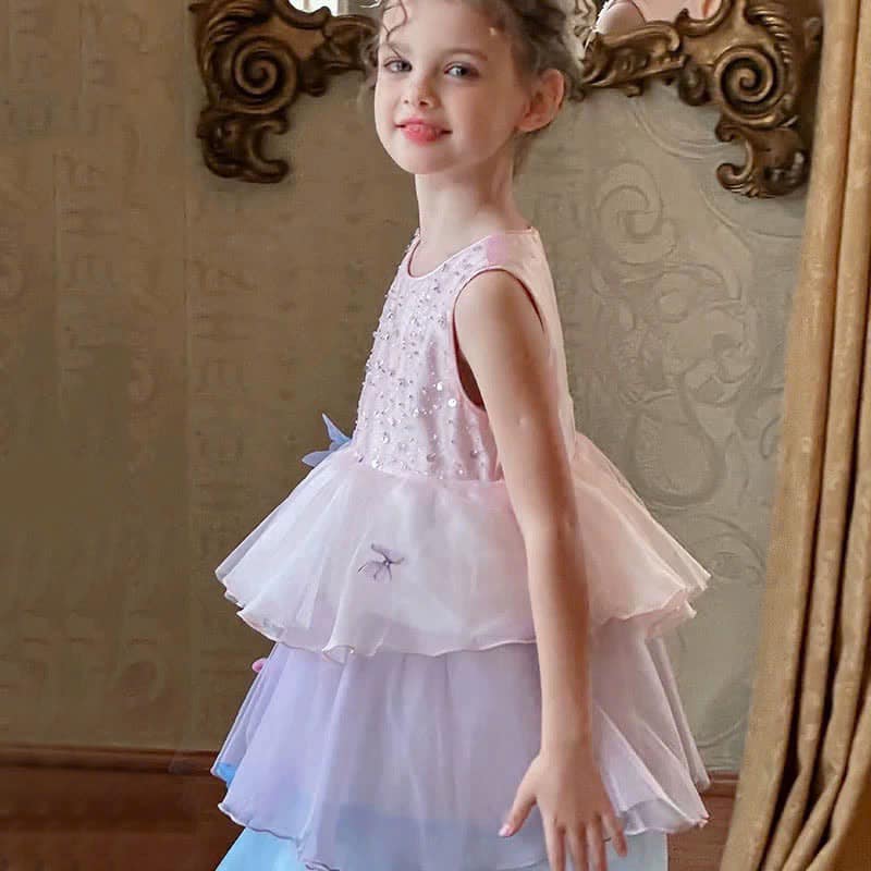 The vibrant pink hue, combined with sparkling sequin details exquisitely adorned on each tier, creates a stunning light-catching effect that’s both radiant and captivating. Its voluminous, wide-flared tiered design not only adds to the dress’s grandeur but also allows for easy movement and play. Crafted from premium, soft, and breathable fabric, this dress guarantees your child stays comfortable and at ease, even during extended wear.